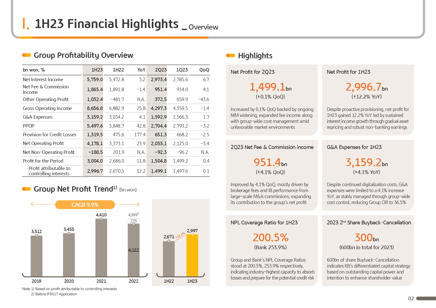 2Q23 group's net profit was KRW 1,499.1 billion, up 12.2% on year to KRW 2,996.7 billion as of