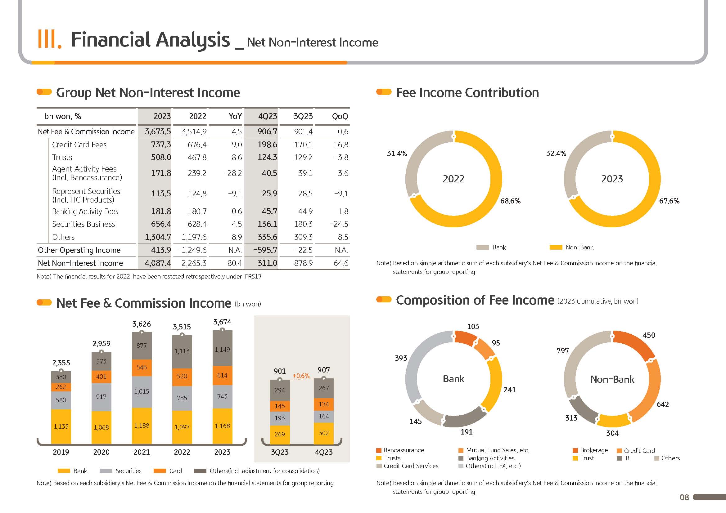 Next, the group's net fee income and commission posted KRW 3,673.5 billion, up 4.5% YoY in 2023,