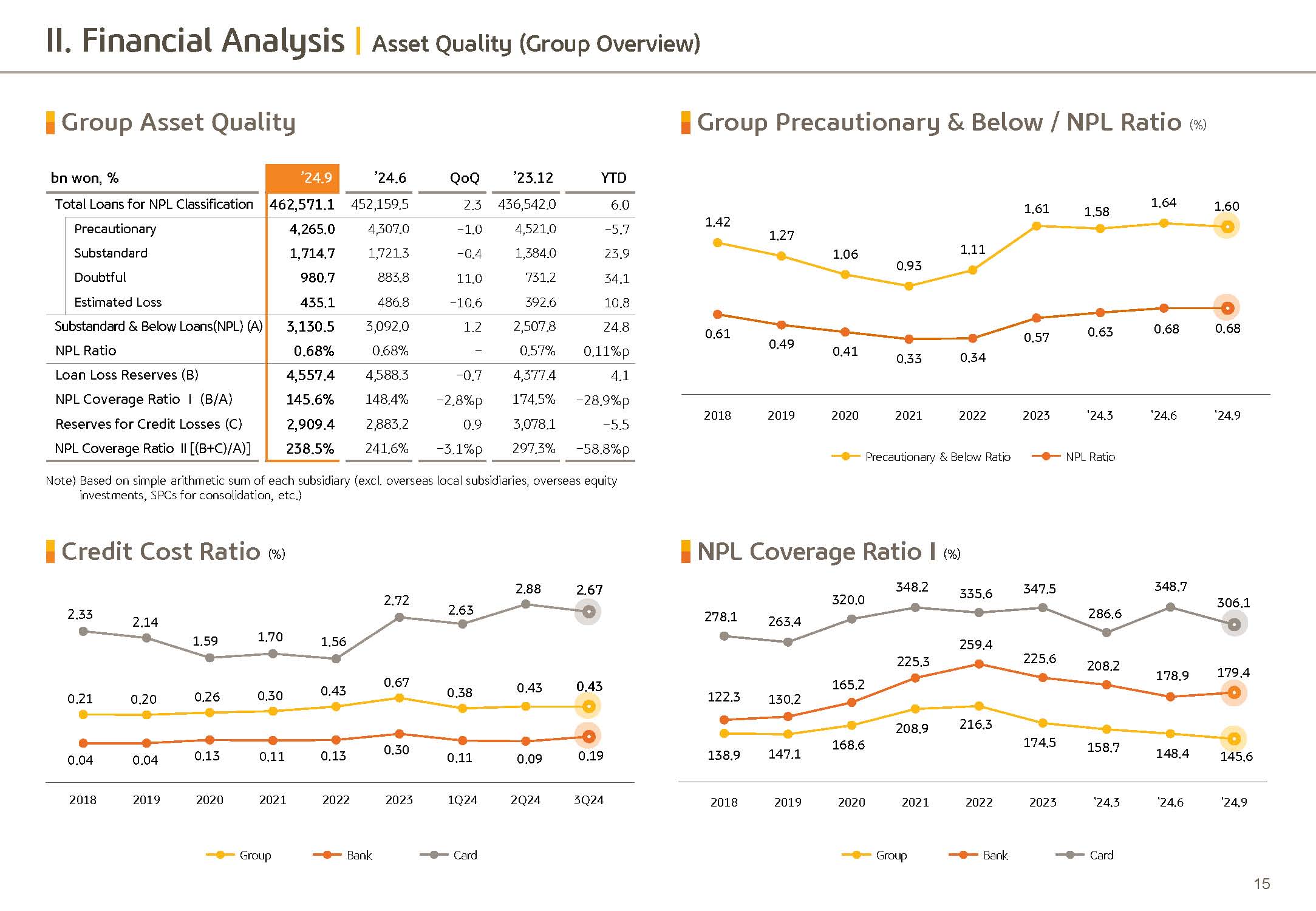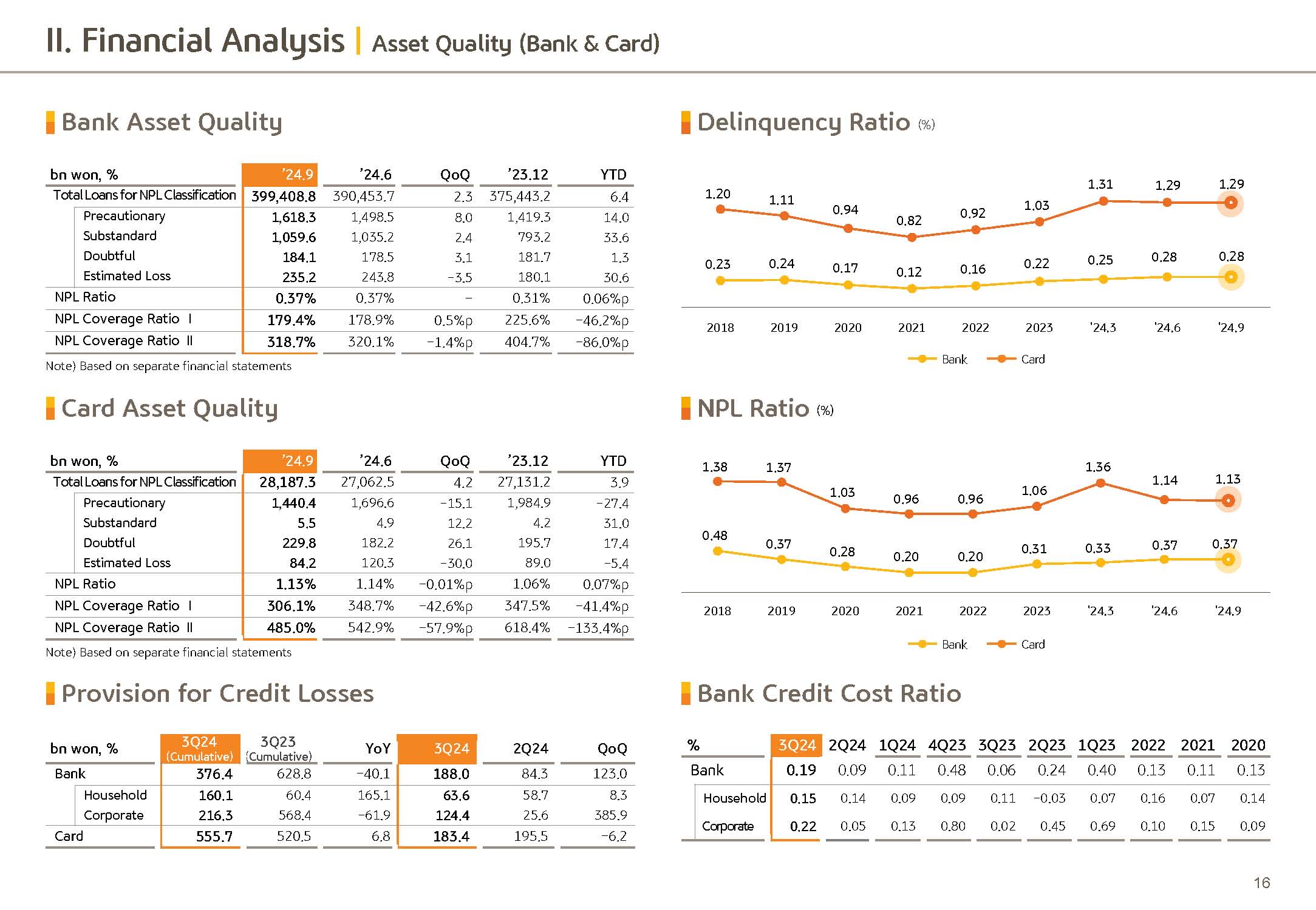 Third quarter PCL was KRW498.1 billion, down 9.9% Q over-Q, mainly due to lessened burden for provisioning