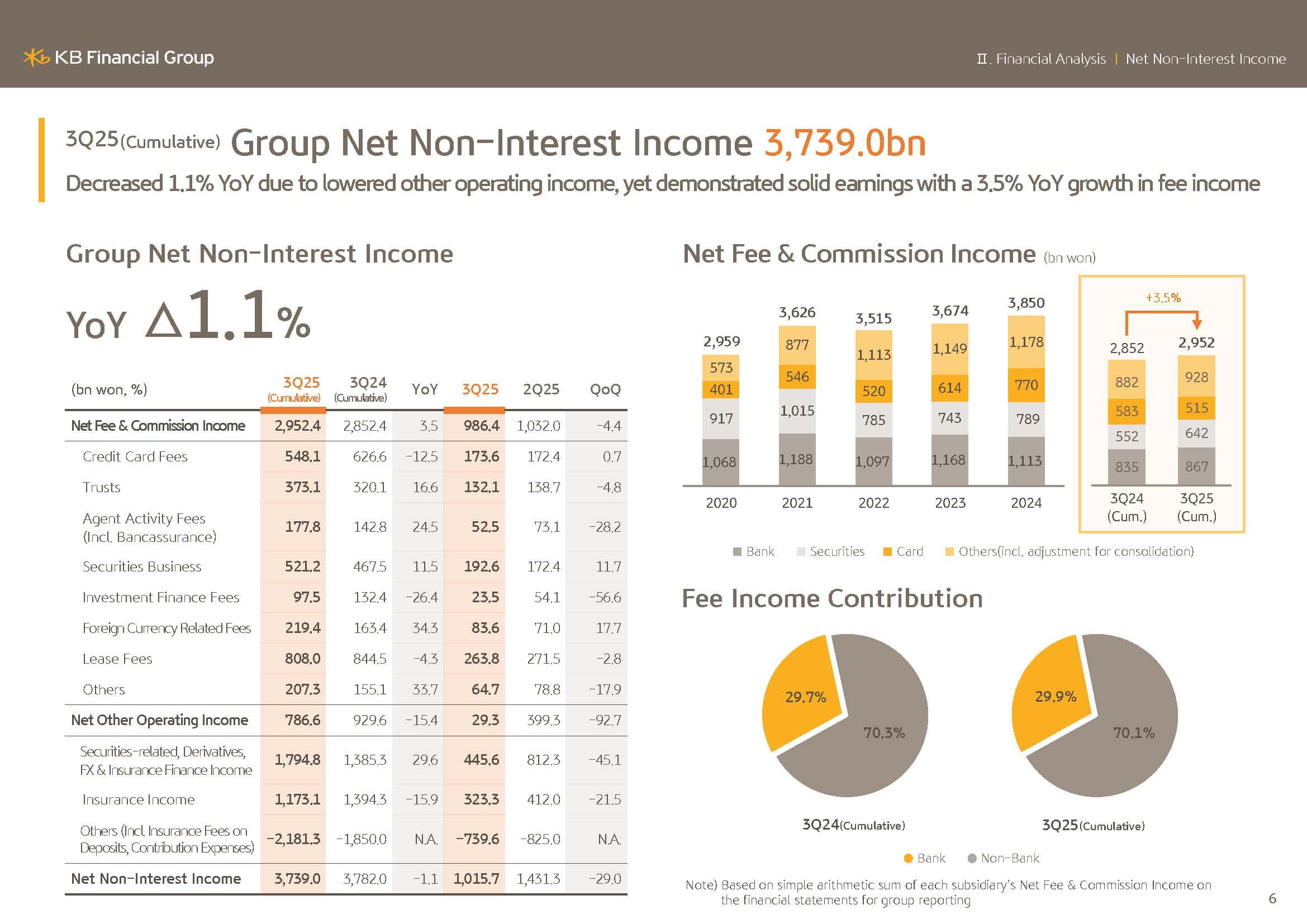 Q3 cumulative group noninterest income posted KRW 3,739 billion, a 1.1% decrease Y-o-Y. Q3