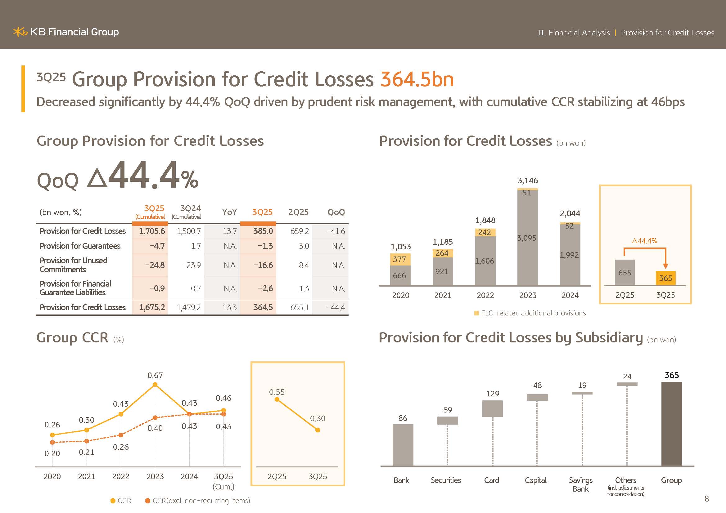 Q3 provision for credit losses posted KRW364.5 billion, a 44.4% decrease Q-o-Q. Q3 group credit cost