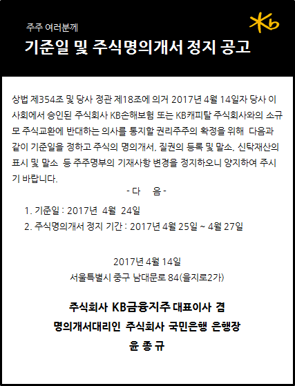 KB금융지주 소규모 주식교환 공고(KB손해보험)