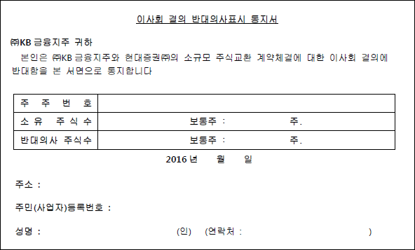 2016년8월12일 현재 주주명부상에 등재되어 있는 KB금융지주의 주주 중 금번 주식교환에 대한 이사회 결의에 반대하는 주주는“이사회 결의 반대의사표시 통지서”(양식1 참조)를 작성하여 제출