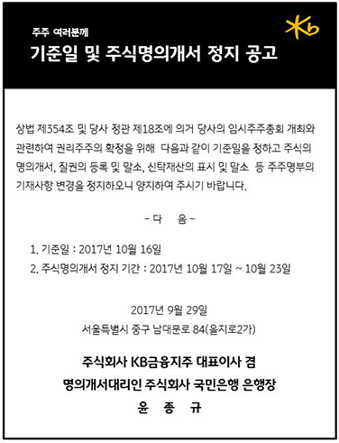 주식회사 KB금융지주 대표이사 겸 명의개서 대리인 주식회사 국민은행 은행장 윤종규.